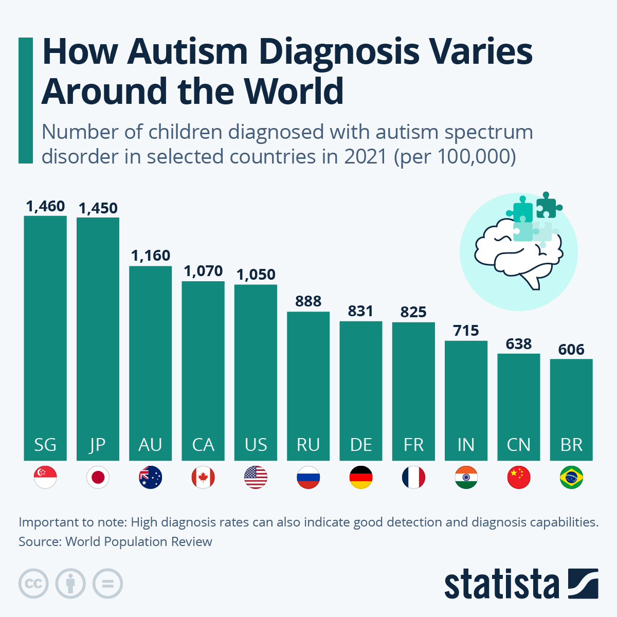 Rates of diagnosis of Autism Spectrum Disorder (ASD) vary significantly around the world. According to data published by the World Population Review, countries with the highest number of diagnoses of childhood autism per 100,000 children include Singapore (1,460), Japan (1,450) and Australia (1,160), while those ranked among the lowest rates include China (638) and Brazil (606). These differences in diagnosis may be influenced by a number of factors, such as access to health services, diagnostic methodologies and levels of public awareness.